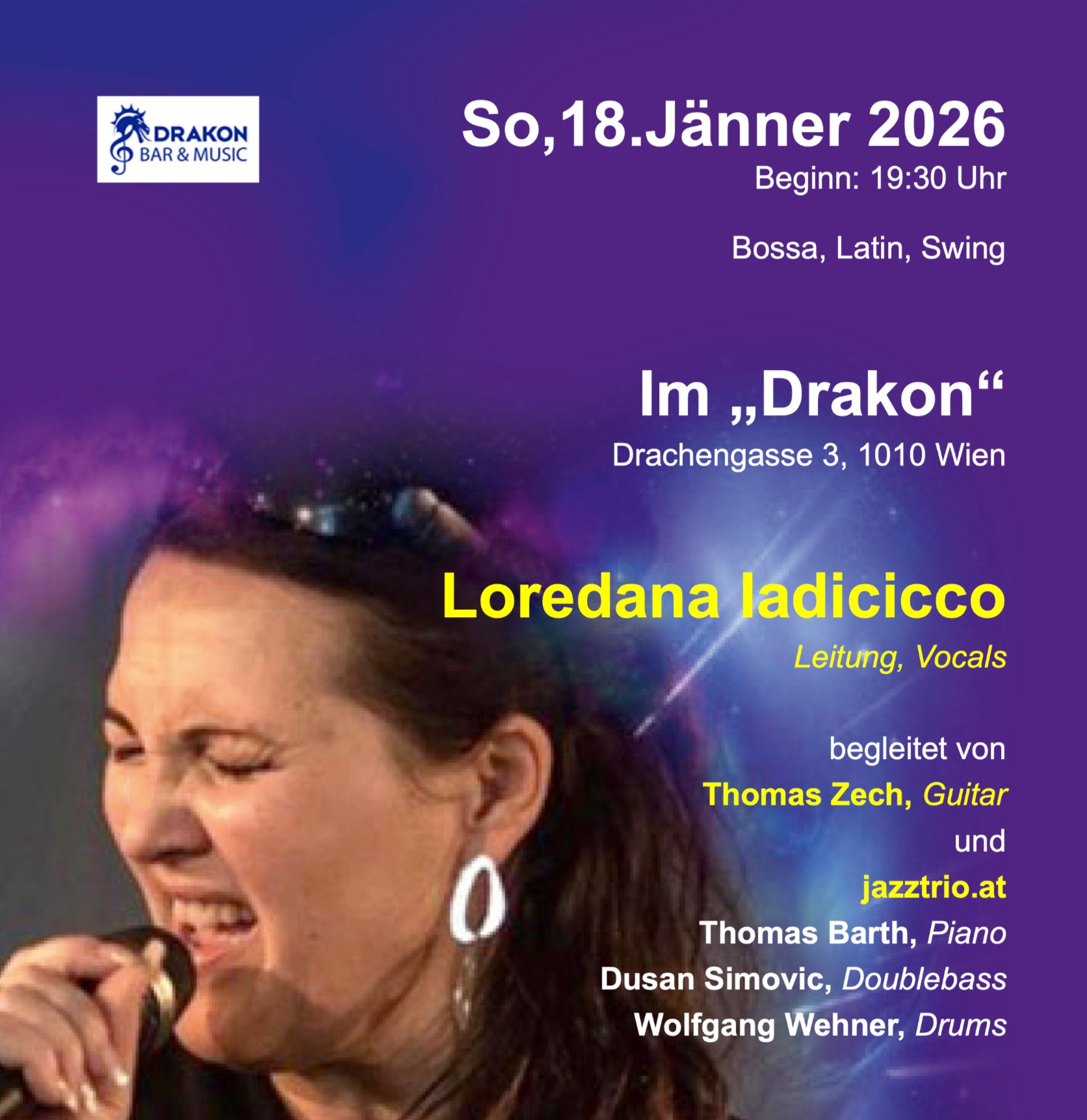 Wir freuen uns auf das Konzert + Jam Session mit Loredana Iadicicco am SO. 18.01.2026 im Drakon!